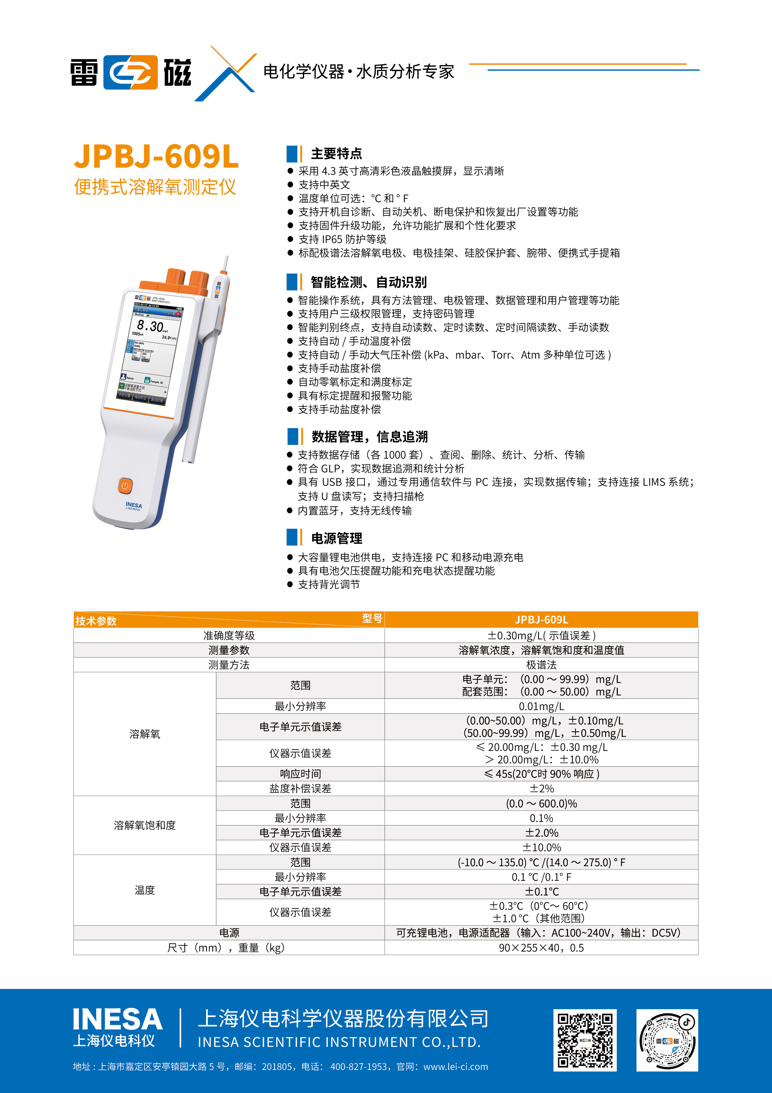 JPBJ-609L Это новое поколение интеллектуального высококачественного портативного прибора для растворения кислорода. Инструмент принимает 4,3-дюймовый сенсорный экран с новым дизайном внешнего вида. ; Интеллектуальная операционная система, поддерживает нулевой кислород и полномасштабную калибровку, поддерживает автоматическую компенсацию атмосферного давления, поддерживает множественные методы чтения и поддерживает функции управления данными ; В то же время он использует литиевые батареи для питания, что значительно расширяет время использования инструмента и облегчает пользователям его использовать на месте.