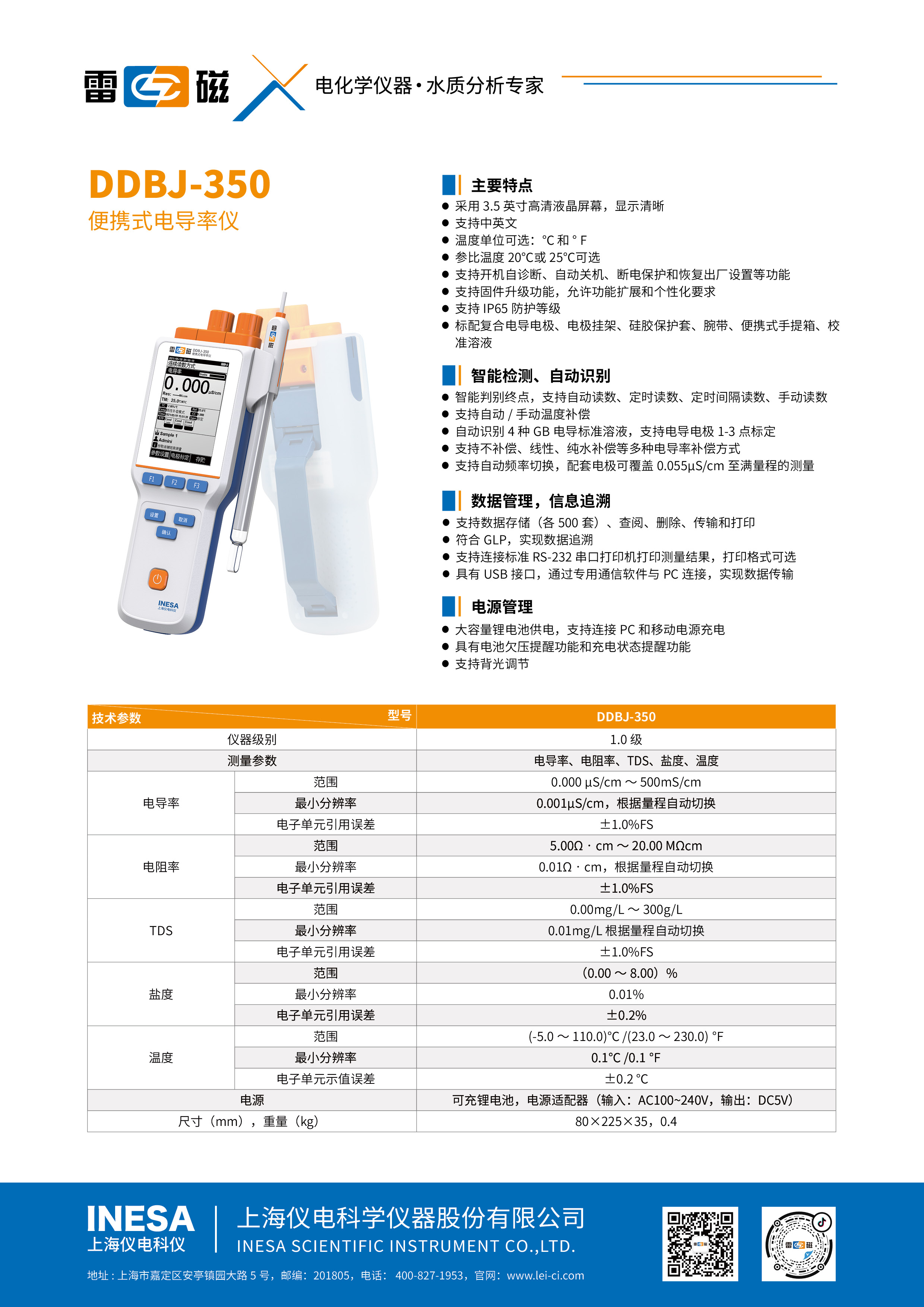 ●Инструмент может выполнять проводимость, TDS 、 Измерения солености и температуры;
